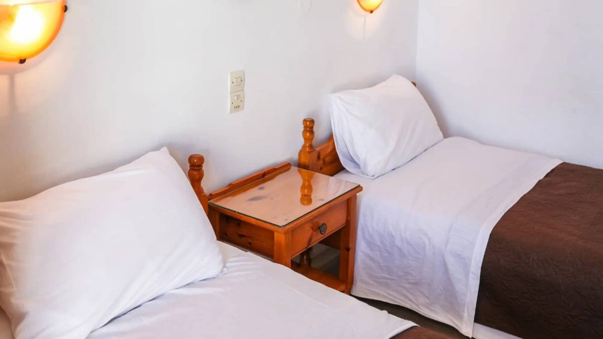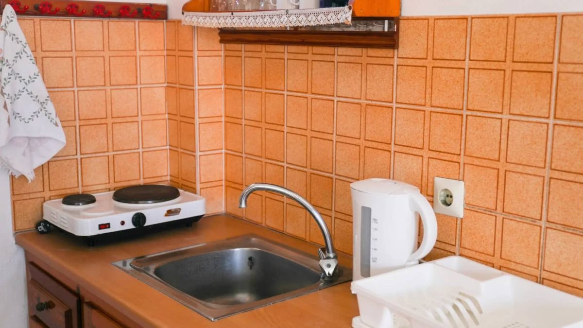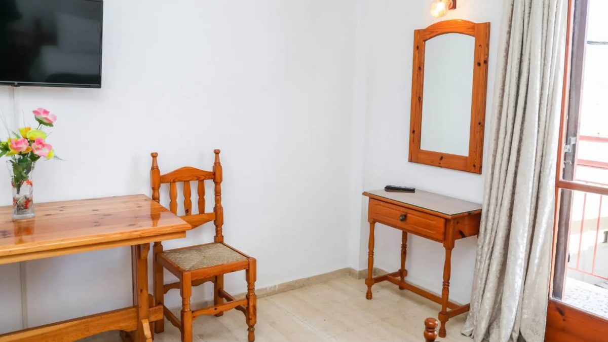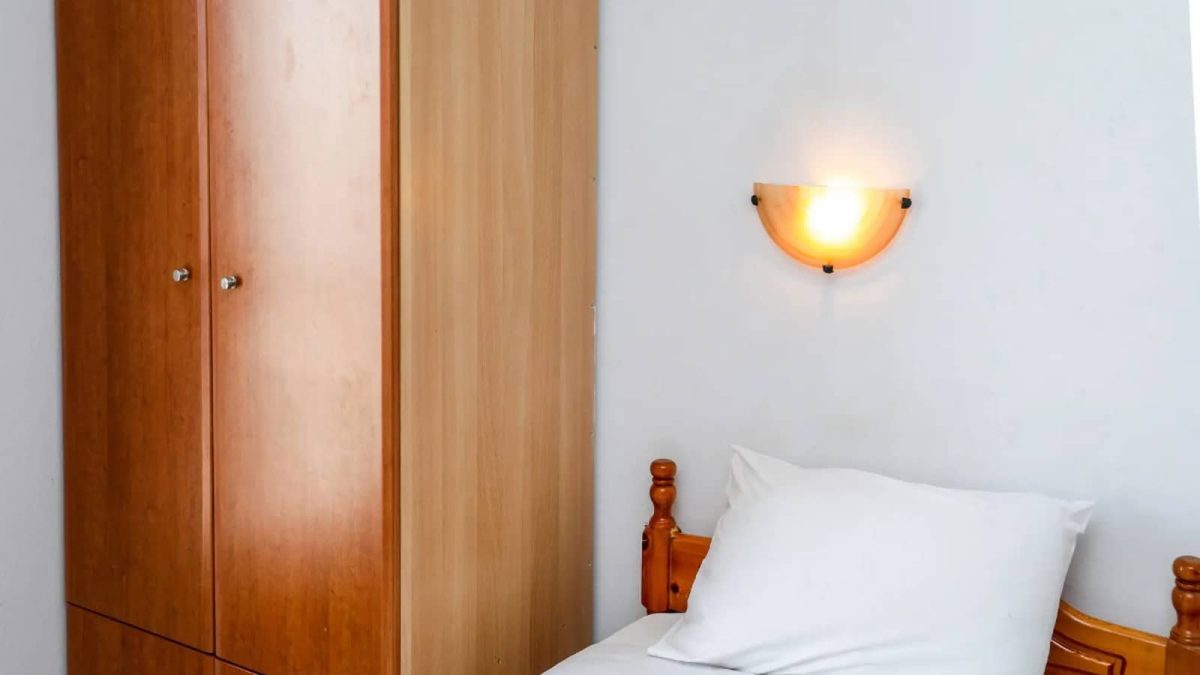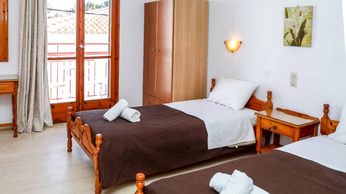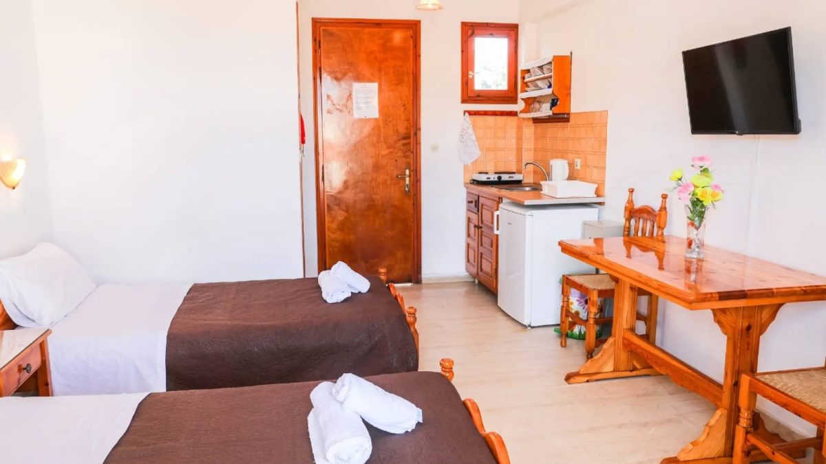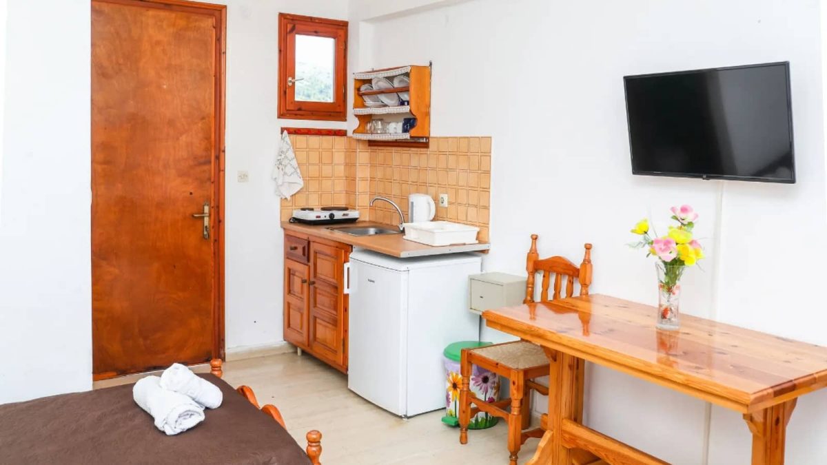Opis: Alekos studios raspolaže dvokrevetnim studijima koji se nalaze u prizemlju. Svaka smeštajna jedinica ima kompletno opremljenu čajnu kuhinju u okviru sobe, kupatilo (tuš/WC), TV, balkon, kao i klima uređaj čije se korišćenje doplaćuje na licu mesta (8 € dnevno po smeštajnoj jedinici). Ova doplata nije obavezna.
