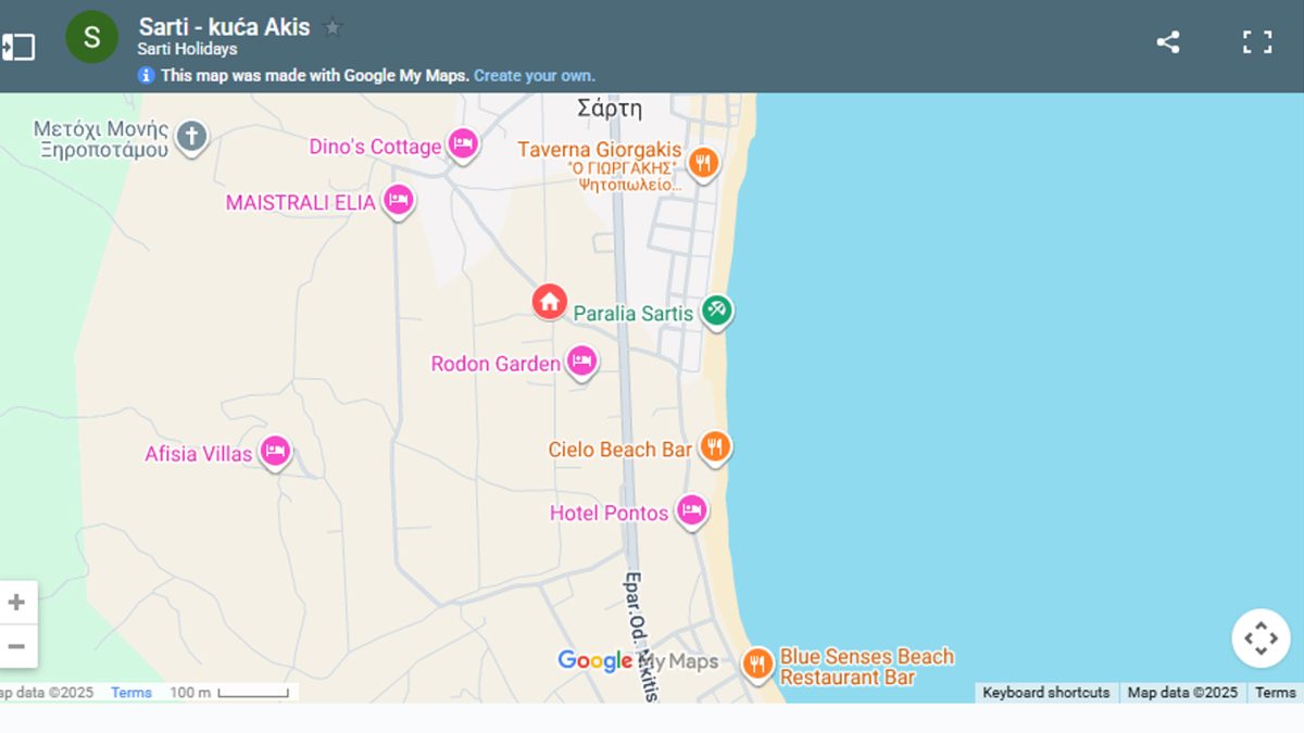 Nalazi se na oko 390m od mora, sa uređenim dvorištem sa roštiljem, parkingom i manjim dečijim igralištem. Studiji za 2 do 4 osobe su smešteni u prizemlju i na prvom spratu.Kuća ima SAT TV, signal za besplatan bežični internet i klima uređaje čije je korišćenje uključeno u cenu. Gostima je na raspolaganju dvorište sa bazenom i roštiljem u kući Katerina Resort koja je udaljena nepunih 50m. Uz minimalnu doplatu je omogućeno korišćenje i veš mašine.