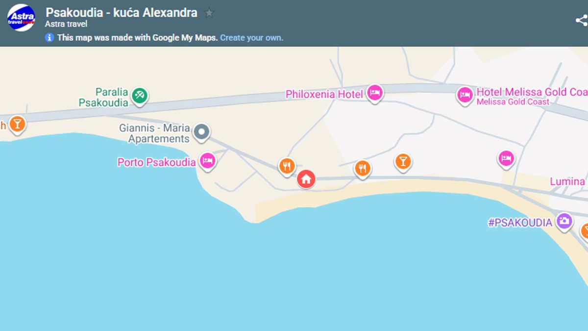 Kuća Alexandra nalazi se na samoj plaži mesta Psakoudia i odlikuje se terasama koje imaju direktan pogled na more. Četvorokrevetni studiji i apartmani nalaze se na prvom i drugom spratu. Kuća ima signal za bežični internet, a smeštajne jedinice imaju TV i klima uređaj čije je korišćenje uključeno u cenu u julu i avgustu.