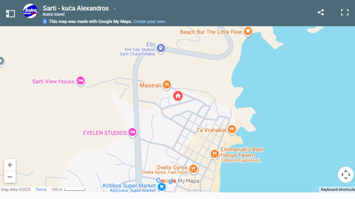 Nalazi se u starom delu Sartija na uzvišenju blizu crkve, na oko 250m od gradske plaže i od najbližih uvala. Na samo 120m od centra, a opet daleko od buke i vreve. U ponudi su studiji za 2-4 osobe, kao i apartmani za 4-5 osoba koji imaju prostrane terase, a neki od njih imaju panoramski pogled na more i ceo Sarti. Posebno ističemo komforne apartmane za 5 osoba na spratu sa pogledom na more i dve terase. Kuća ima WIFI, SAT TV kao i klima uređaje čije je korišćenje uključeno u cenu u julu i avgustu