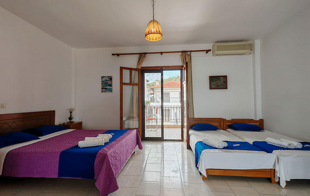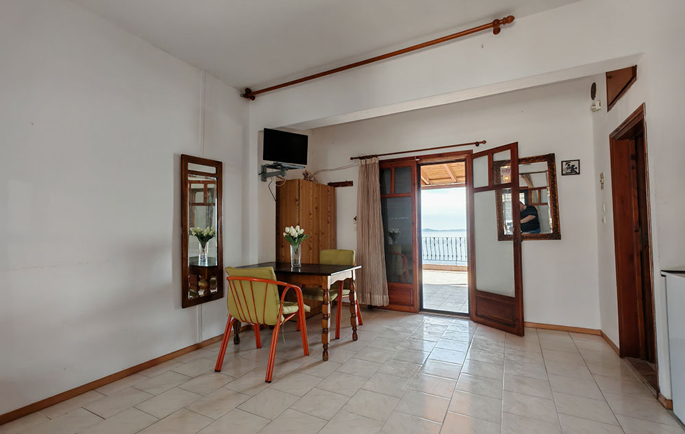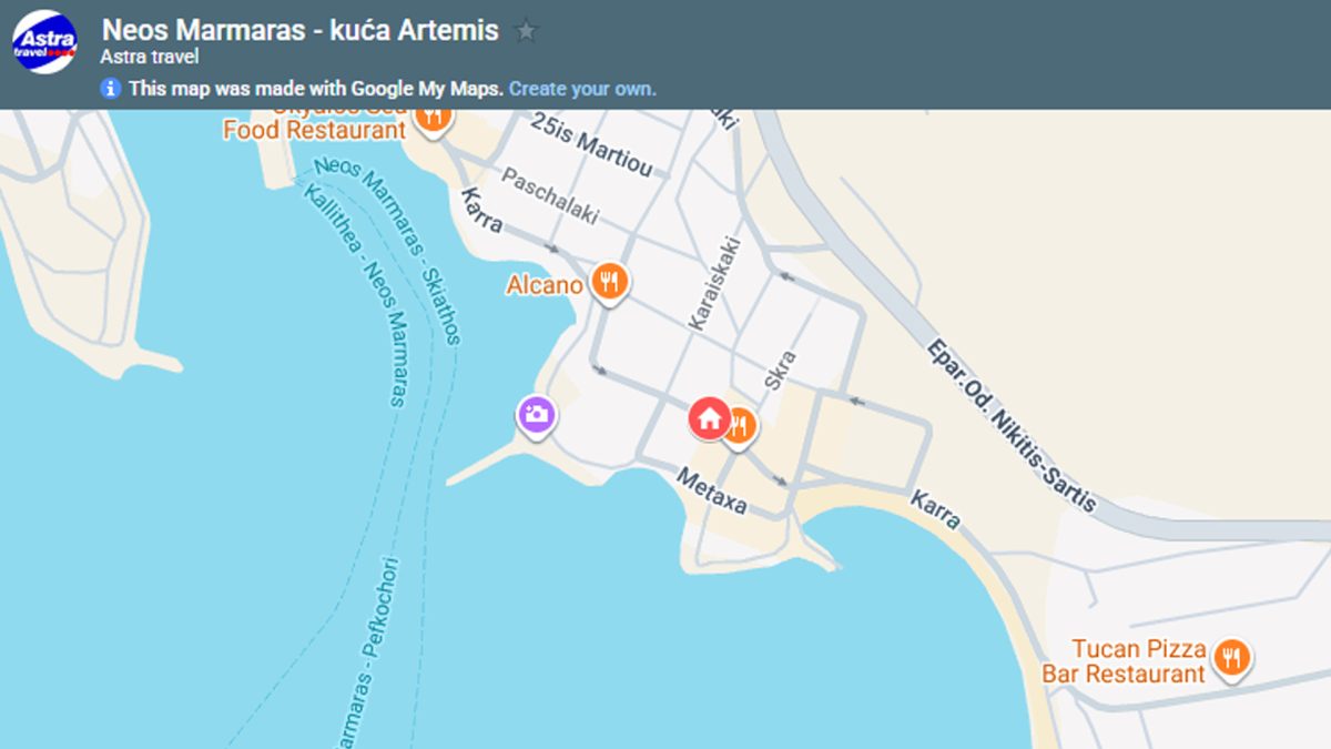 Kuća Artemis se nalazi na 150m od gradske plaže u Neos Marmarasu. U ponudi su trokrevetni i četvorokrevetni studio na prvom spratu sa izuzetno prostranim terasama sa direktnim pogledom na more. Svi imaju kuhinju, dve terase, jednu okrenutu ka moru, televizor, klima čije je korišćenje uključeno u cenu u julu i avgustu kao i signal za besplatno korišćenje bežičnog interneta. Od 01.05. pored studija sa pogledom na more u ponudi su i studiji bez pogleda na more u koje se ulazi tako što se spušta u nisko prizemlje, ali terase nisu ispod nivoa ulice već su okrenute ka moru i izdignute su na nivo visokog prizemlja.