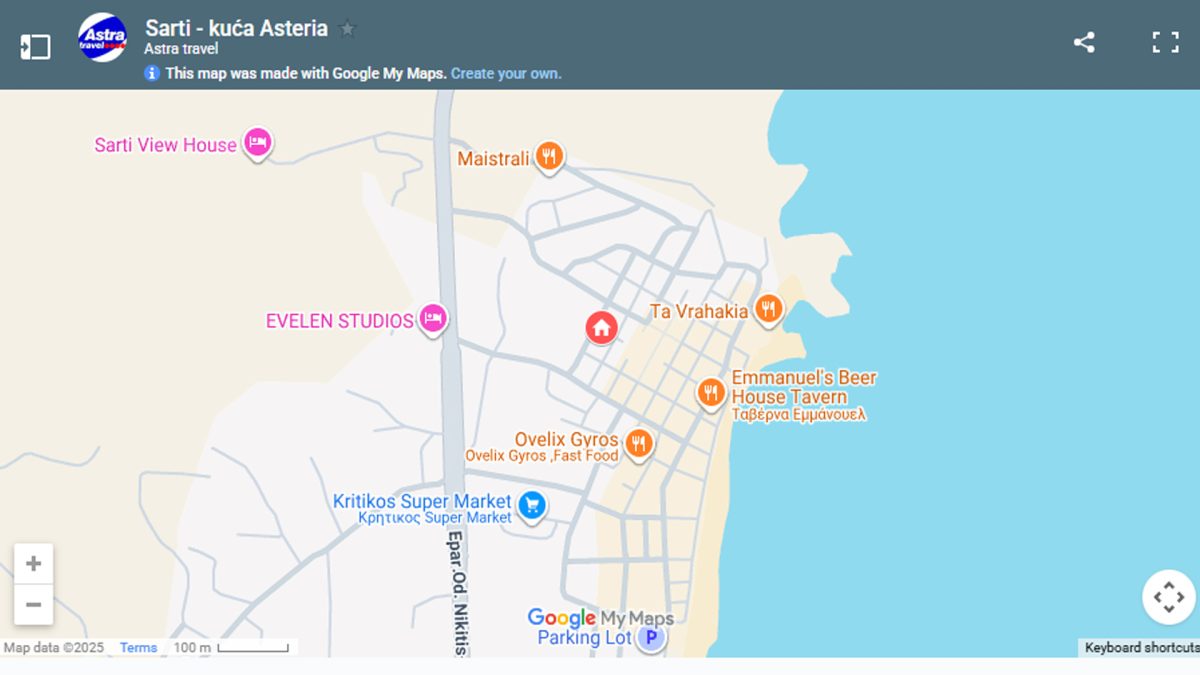 Nalazi se u starom delu Sartija na oko 180m od plaže. U ponudi su apartmani za 3-4 osobe, koji se nalaze na drugom spratu. Ovi apartmani su pogodni za porodice sa malom decom (zid nije pune visine, pa se mogu čuti deca u susednoj sobi). Kuća ima SAT TV, besplatan signal za WIFI i klima uređaje uz doplatu, kao i čišćenje na pola smene prilikom zamene posteljine.