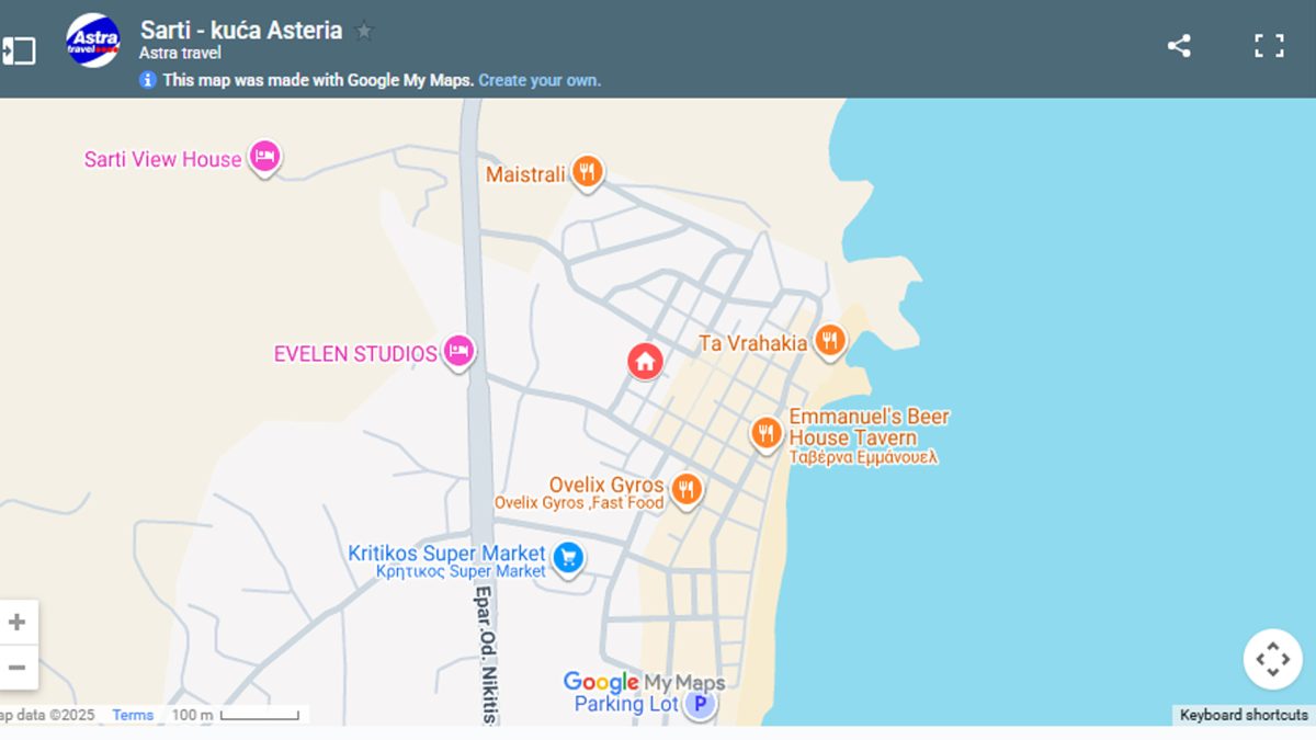 Nalazi se u starom delu Sartija na oko 180m od plaže. U ponudi su apartmani za 3-4 osobe, koji se nalaze na drugom spratu. Ovi apartmani su pogodni za porodice sa malom decom (zid nije pune visine, pa se mogu čuti deca u susednoj sobi). Kuća ima SAT TV, besplatan signal za WIFI i klima uređaje uz doplatu, kao i čišćenje na pola smene prilikom zamene posteljine.