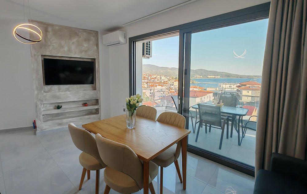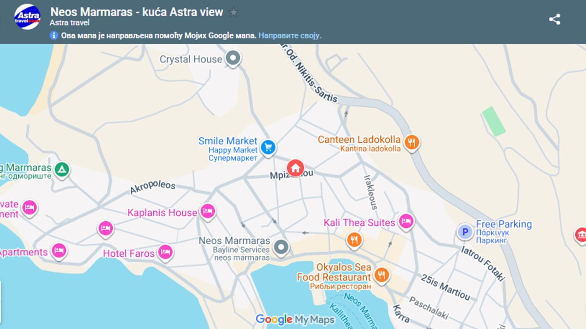 Potpuno nova kuća Astra View primila je svoje prve goste u julu 2024. godine. U ponudi su apartmani i duplexi na prvom, drugom i trećem spratu kao i superior studio na četvrtom spratu. Sa izuzetkom apartmana i duplexa na prvom spratu svi ostali imaju prostrane terase sa direktnim pogledom na mesto, more i najlepši zalazak sunca u Neos Marmarasu. Kuća poseduje lift koji je gostima na raspolaganju. Nalazi se u centru Neos Marmarasa na samo 180m od glavnog trga i čuvene Roma Pizze gde se nalazi i luka za turističke brodiće. Kuća ima signal za besplatno korišćenje bežičnog interneta, a smeštajne jedinice imaju SAT TV i klima uređaje čije je korišćenje uključeno u cenu od 19.06 do 15.09. Na pola smene je organizovano čišćenje i zamena peškira i posteljine. Kuća ima ograničen broj parking mesta.