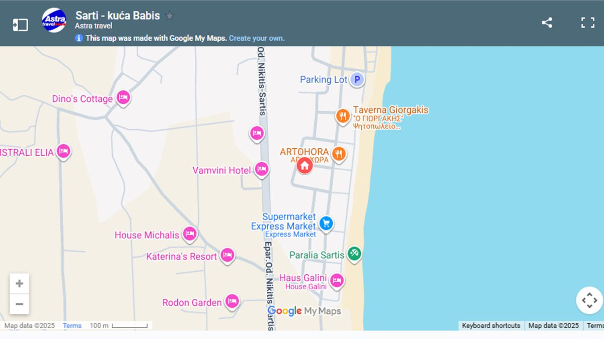 U Sartiju, na sredini između novog i starog dela Sartija, odmah pored velikog parkinga, na samom početku šetališta nalazi se agencija Astra Travel. Na ovom mestu se gosti javljaju predstavniku po dolasku u Sarti, a predstavnik ih dalje usmerava do smeštajnih jedinica. Takođe tokom boravka u vreme dežurstva agencije mogu dobiti neophodne informacije i infomisati se oko fakultativnih izleta. Fakultativne izlete organizuje lokalni grčki partner, a većina izleta organizovana je u pratnji predstavnika agencija na srpskom jeziku.