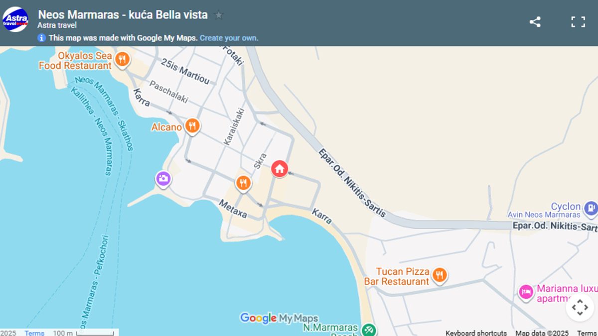 Kuća Bella Vista se nalazi na svega 90m od gradske plaže u najtraženijem delu Neos Marmarasa blizu fudbalskog igrališta. U ponudi su studiji za 2 do 3 osobe koji se nalaze na drugom, trećem i četvrtom spratu. Kuća ima signal za korišćenje bežičnog interneta, a studiji imaju TV i klima uređaj čije je korišćenje uključeno u cenu. Neke sobe imaju pogled na more.