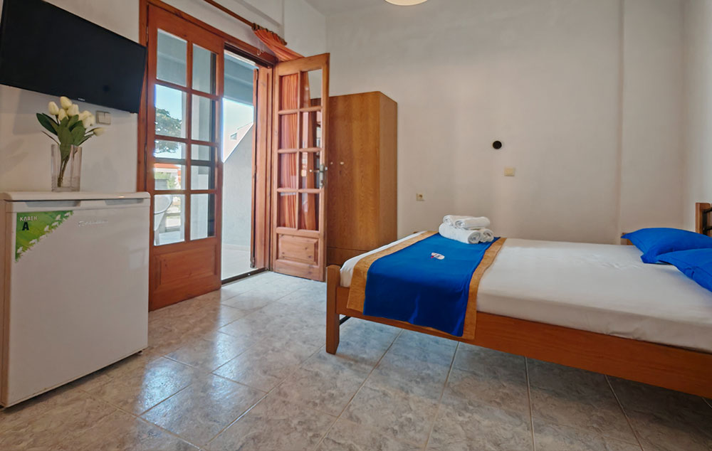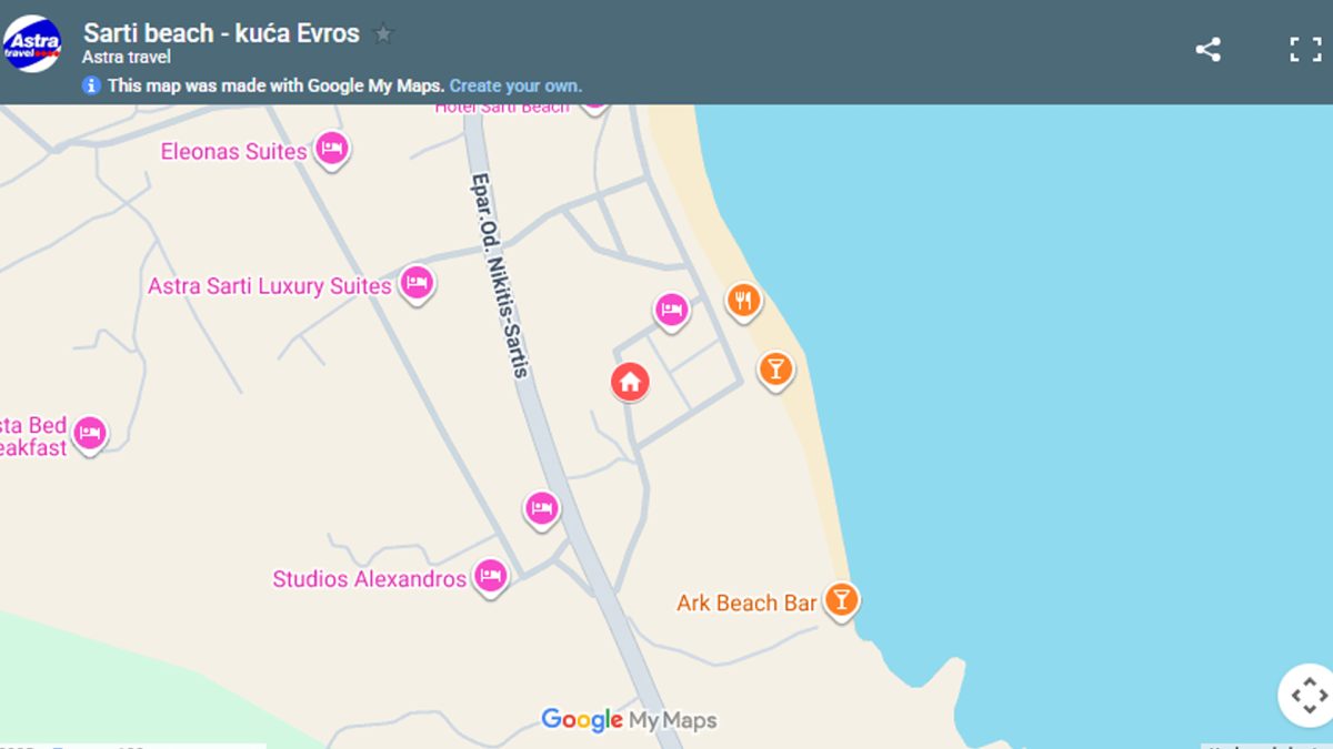 Kuća Evros se nalazi na 120m od plaže u Sarti beach-u. Studiji se nalaze na prvom i drugom spratu i imaju pogled na more. Kuća ima signal za besplatno korišćenje bežičnog interneta, a smeštajne jedinice imaju TV i klima uređaj čije se korišćenje posebno doplaćuje. Apartmani se nalaze u prizemlju, imaju po dve spavaće sobe, s tim da jedna od soba nema prozor i zato se prodaju po povoljnijoj ceni. Odličan su izbor za porodice koje žele povoljniji apartmanski smeštaj.
