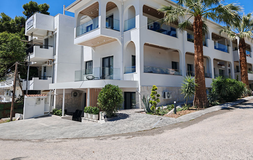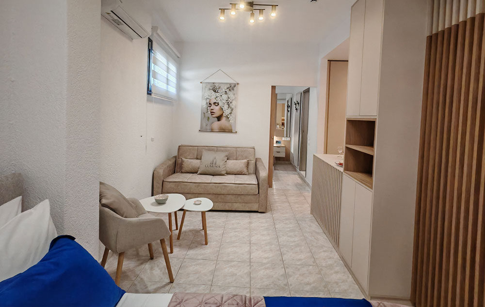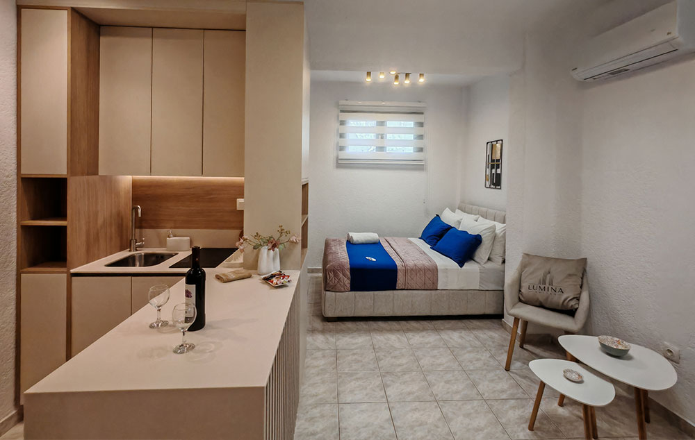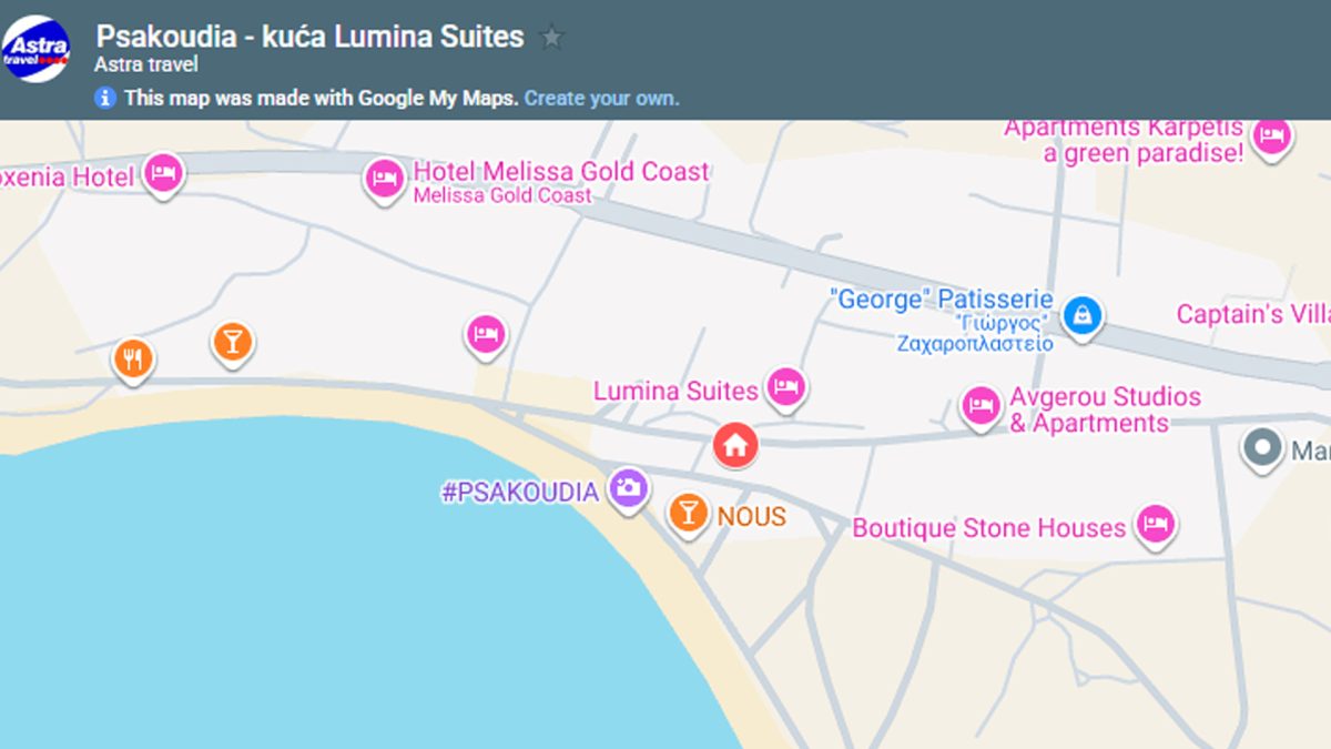 Potpuno renovirana Lumina Suites nalazi se u najlepšem delu Psakudije na samo 90m od mora i blagom uzvišenju koje većini studija i apartmana pruža pogled na more. Kuća je do sad bila poznata pod nazivom Pandora ali od sezone 2025 goste dočekuje u potpuno novom i renoviranom izdanju. Kuća ima SAT TV, besplatan signal za korišćenje bezičnog interneta kao i klima uređaj čije je korišćenje uključeno u cenu. Sobe broj 3, 4, 5 i 6 su označene kao smeštajne jedinice sa izdvojenom terasom u cenovniku i umesto terase na raspolaganju im je letnjikovac gde će imati svoje izdvojeno mesto za stolove i stolice. Za period boravka do 7 noći organizovano je čišćenje i menjanje posteljina na pola smene, a za duži period boravka predviđeno je čišćenje i menjanje posteljine 2 puta u toku smene.