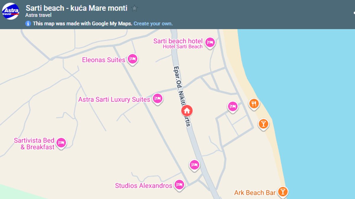 Kuća Mare Monti se nalazi na 190m od najlepšeg dela plaže u Sarti beach-u. U ponudi su studiji za 2 do 4 osobe, koji se nalaze u niskom prizemlju, prvom i drugom spratu, kao i studiji sa galerijom za do 5 osoba koji se nalaze u prizemlju. Kuća ima SAT TV, WIFI i klima uređaj čije se korišćenje posebno doplaćuje. Gostima je na raspolaganju korišćenje bazena koji je u dvorištu kuće.