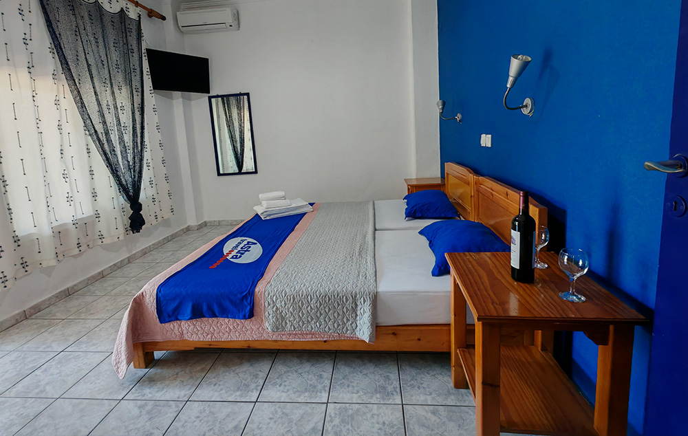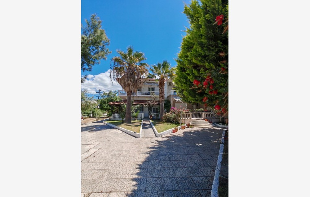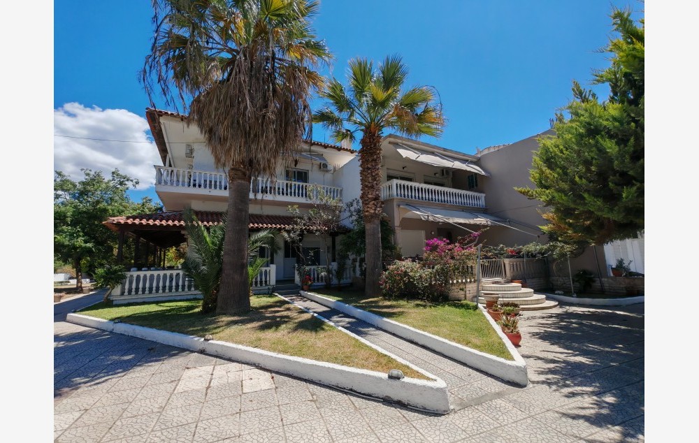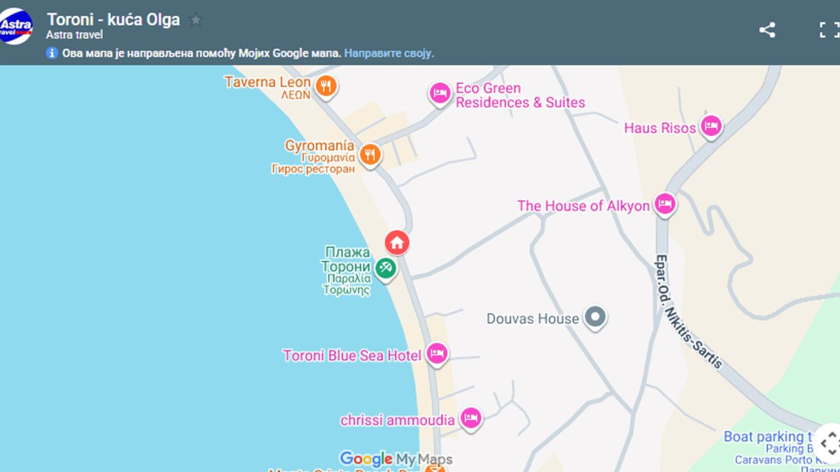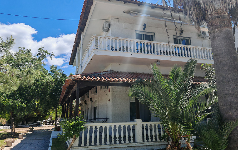 Nalazi se na najlepšem delu plaže. Studiji, apartmani i duplexi su u glavnoj zgradi, smešteni u prizemlju i na prvom spratu. Studiji imaju blago izdvojenu kuhinju, a u spavaćem delu dva klasična kreveta i jednu ili dve fotelje na razvlačenje. Apartmani i duplexi imaju terase sa pogledom na more. Kuća ima SAT TV, signal za bežični internet kao i klima uređaje čije je korišćenje uključeno u cenu. Prilikom zamene posteljine je organizovano i čišćenje smeštaja. Zbog lokacije ovo je jedan od ubedljivo najtraženijih smeštaja u Toroniju.
