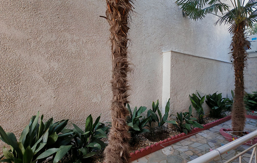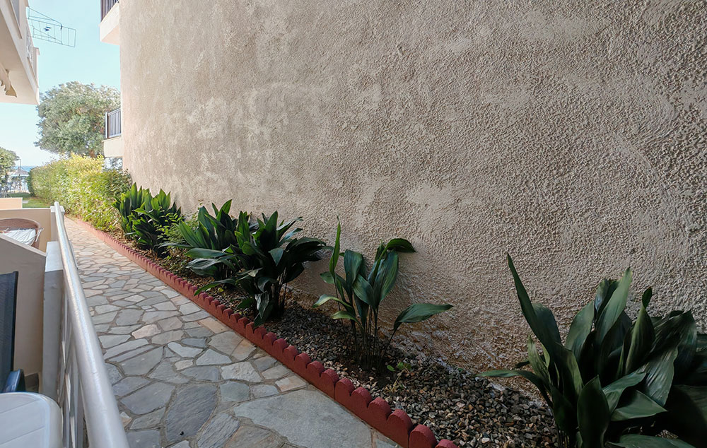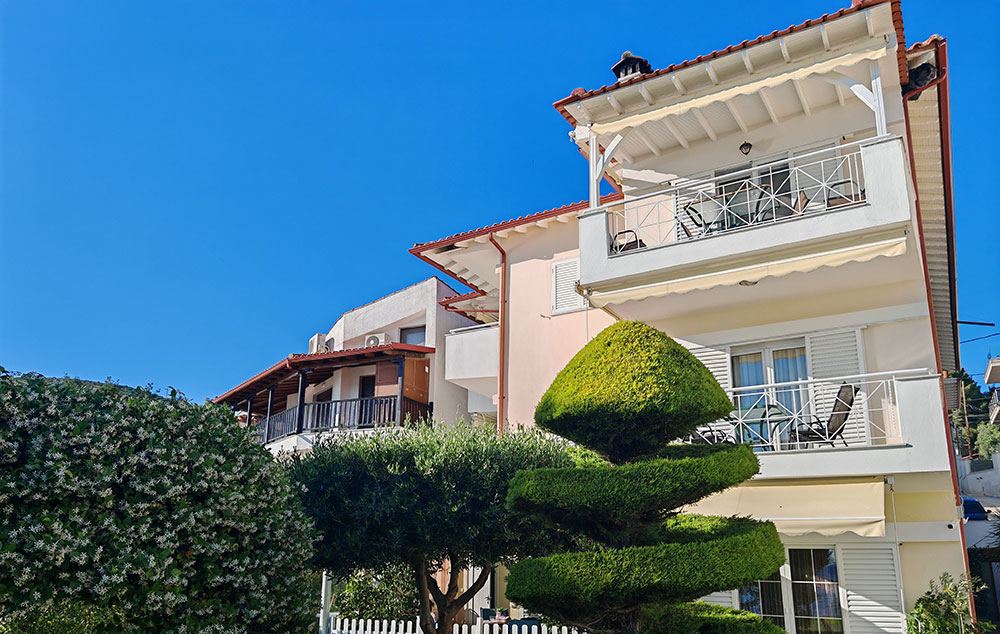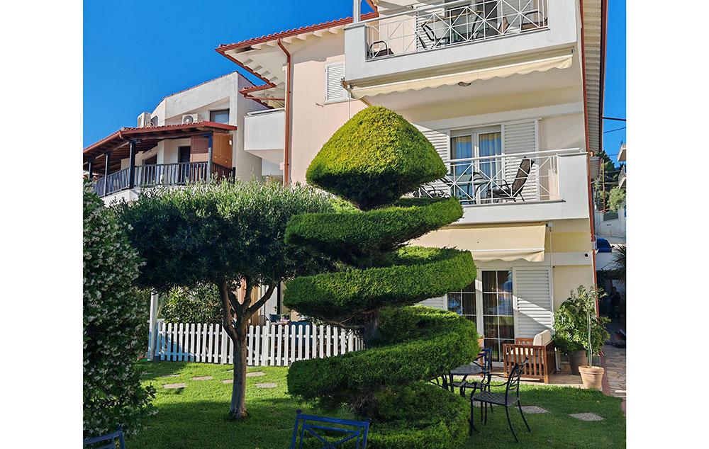 Nalazi se na samoj plaži Psakudije. Glavne prednosti ove kuće su prelepo dvorište sa puno zelenila i skoro pa privatna plaža sa ležaljkama i suncobranima koje su (u ograničenom broju) na usluzi gostima bez naknade. Studiji i apartmani su u prizemlju i na drugom spratu. Kuća ima SAT TV, besplatan signal za korišćenje bežičnog interneta kao i klima uređaj čije je korišćenje uključeno u cenu.