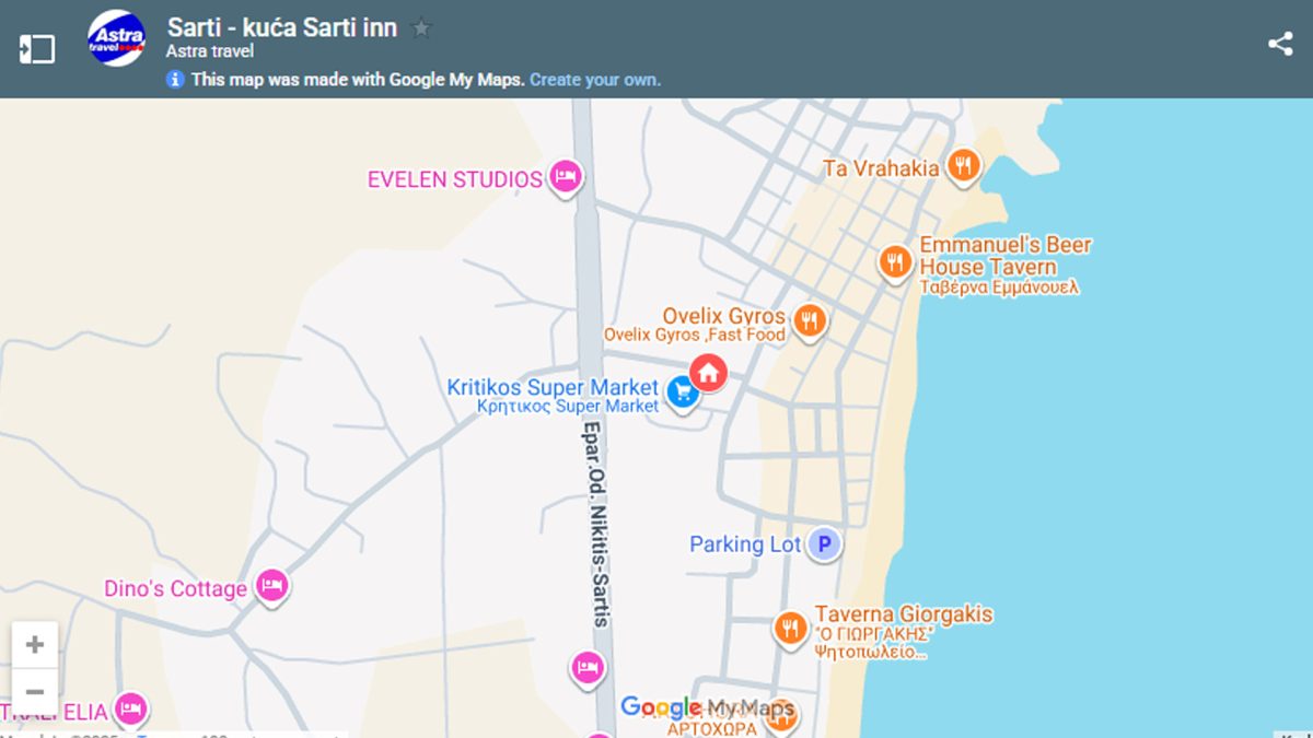 U Sartiju, na sredini između novog i starog dela Sartija, odmah pored velikog parkinga, na samom početku šetališta nalazi se agencija Astra Travel. Na ovom mestu se gosti javljaju predstavniku po dolasku u Sarti, a predstavnik ih dalje usmerava do smeštajnih jedinica. Takođe tokom boravka u vreme dežurstva agencije mogu dobiti neophodne informacije i infomisati se oko fakultativnih izleta. Fakultativne izlete organizuje lokalni grčki partner, a većina izleta organizovana je u pratnji predstavnika agencija na srpskom jeziku.