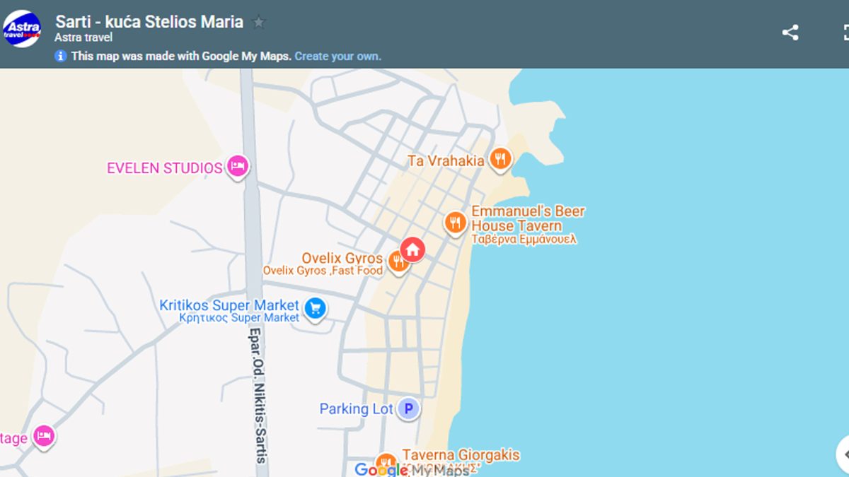 U Sartiju, na sredini između novog i starog dela Sartija, odmah pored velikog parkinga, na samom početku šetališta nalazi se agencija Astra Travel. Na ovom mestu se gosti javljaju predstavniku po dolasku u Sarti, a predstavnik ih dalje usmerava do smeštajnih jedinica. Takođe tokom boravka u vreme dežurstva agencije mogu dobiti neophodne informacije i infomisati se oko fakultativnih izleta. Fakultativne izlete organizuje lokalni grčki partner, a većina izleta organizovana je u pratnji predstavnika agencija na srpskom jeziku.