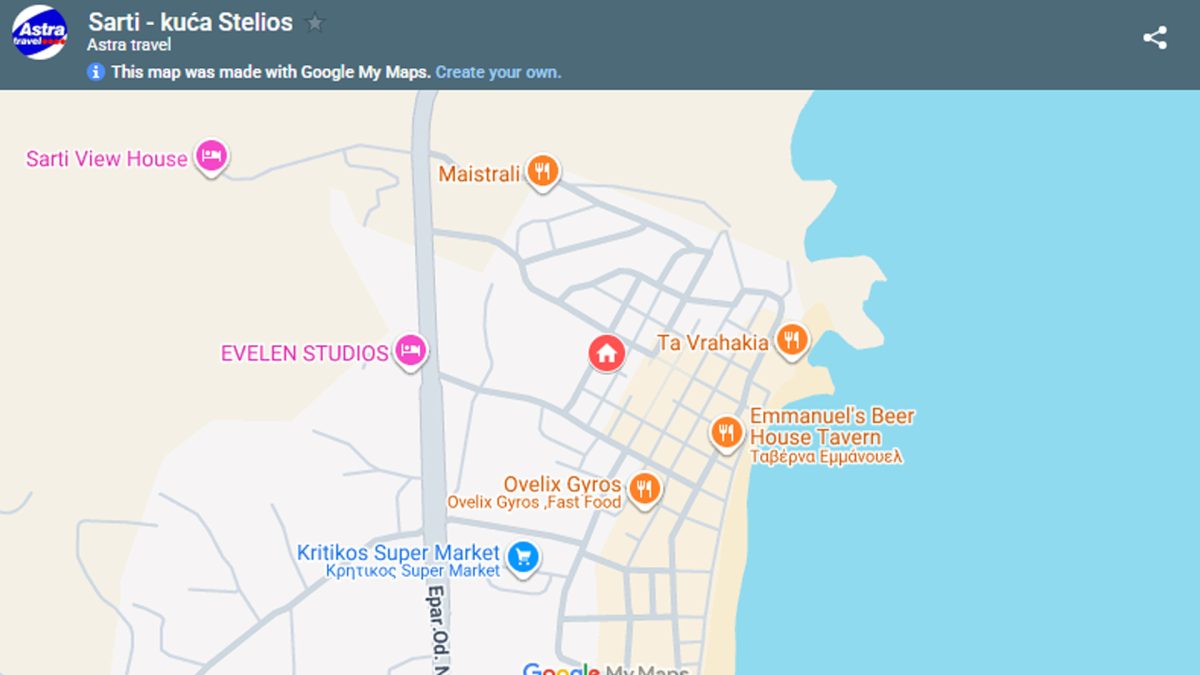 Nalazi se u starom delu Sartija, na oko 180m od mora, a na samo 40m od trga. Apartmani se nalaze na prvom i drugom spratu i imaju prelepe terase sa pogledom ka uređenom dvorištu ispred kuće. Kuća ima SAT TV i signal za besplatno korišćenje bežičnog interneta, kao i klima uređaje čije se korišćenje doplaćuje. Na pola smene je organizovano čišćenje i zamena posteljine i peškira. Deo smeštajnih jedinica je renoviran 2025. godine i jasno je izdvojen u cenovniku kao new.