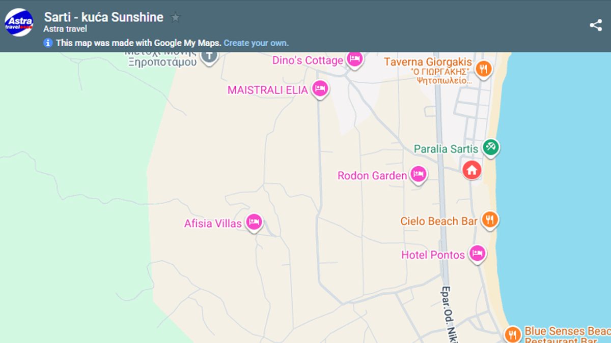 Kuća Sunshine je izuzetno moderan i komforan smeštaj koji se nalazi u novom delu Sartija na samo 40m od mora. U ponudi su studiji za 3-4 osobe u visokom prizemlju, kao i studiji sa galerijom na prvom spratu. Kuća ima signal za besplatan bežični internet, klima uređaje čije je korišćenje uključeno u cenu, kao i SAT TV. U studijima sa galerijom na oba nivoa postoji klima uređaj i SAT TV. Zamena peškira i posteljine vrši se prilikom čišćenja sobe dva puta u toku smene.