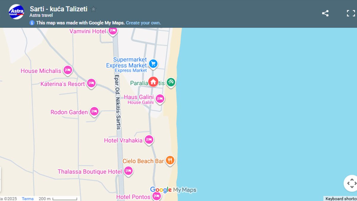 U Sartiju, na sredini između novog i starog dela Sartija, odmah pored velikog parkinga, na samom početku šetališta nalazi se agencija Astra Travel. Na ovom mestu se gosti javljaju predstavniku po dolasku u Sarti, a predstavnik ih dalje usmerava do smeštajnih jedinica. Takođe tokom boravka u vreme dežurstva agencije mogu dobiti neophodne informacije i infomisati se oko fakultativnih izleta. Fakultativne izlete organizuje lokalni grčki partner, a većina izleta organizovana je u pratnji predstavnika agencija na srpskom jeziku.
