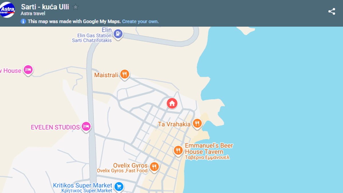 U Sartiju, na sredini između novog i starog dela Sartija, odmah pored velikog parkinga, na samom početku šetališta nalazi se agencija Astra Travel. Na ovom mestu se gosti javljaju predstavniku po dolasku u Sarti, a predstavnik ih dalje usmerava do smeštajnih jedinica. Takođe tokom boravka u vreme dežurstva agencije mogu dobiti neophodne informacije i infomisati se oko fakultativnih izleta. Fakultativne izlete organizuje lokalni grčki partner, a većina izleta organizovana je u pratnji predstavnika agencija na srpskom jeziku.