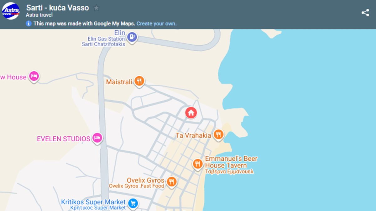 U Sartiju, na sredini između novog i starog dela Sartija, odmah pored velikog parkinga, na samom početku šetališta nalazi se agencija Astra Travel. Na ovom mestu se gosti javljaju predstavniku po dolasku u Sarti, a predstavnik ih dalje usmerava do smeštajnih jedinica. Takođe tokom boravka u vreme dežurstva agencije mogu dobiti neophodne informacije i infomisati se oko fakultativnih izleta. Fakultativne izlete organizuje lokalni grčki partner, a većina izleta organizovana je u pratnji predstavnika agencija na srpskom jeziku.