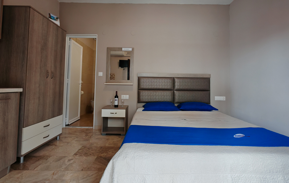 Nalazi se na oko 140m od mora, na uzvišenju pored crkve. Osim gradske plaže, u blizini je i jedna manja uvala sa stenama i peskom. Na drugom spratu nalaze se renovirani studiji i apartmani. Studio za 2-3 osobe ima pogled na celo mesto i u daljini more, dok trokrevetni studio i apartman gledaju ka bašti. Kuća ima signal za besplatan bežični internet, a smeštajne jedinice imaju TV i klima uređaj čije se korišćenje doplaćuje.