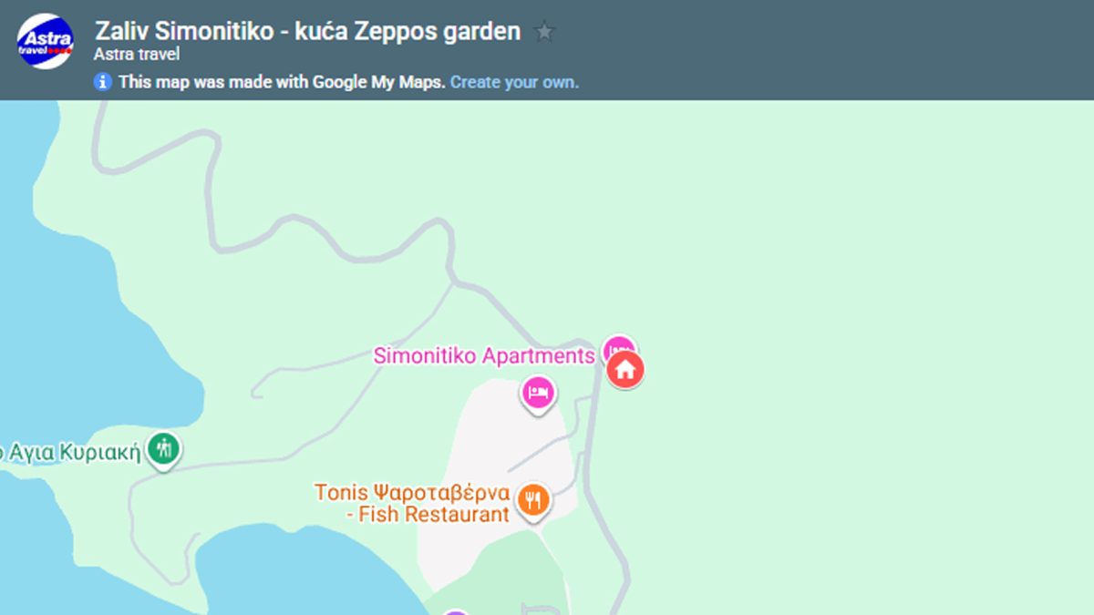 Nalazi se u blizini Neos Marmarasa, u zalivu Simonitiko, na oko 320m od prelepe plaže. U ponudi su studiji i duplexi smešteni u prizemlju, na prvom i drugom spratu. U svojoj ponudi ima dečiju zonu, roštilj i parking. Bazen u okviru kuće Zeppos je na raspolaganju i gostima kuće Zeppos Garden, dok je dečija zona smeštena pod maslinjakom u izuzetno prostranom travnatom dvorištu. Kuća ima SAT TV, klima uređaje uz doplatu, WIFI i parking, kao i čišćenje na pola smene prilikom zamene posteljine.