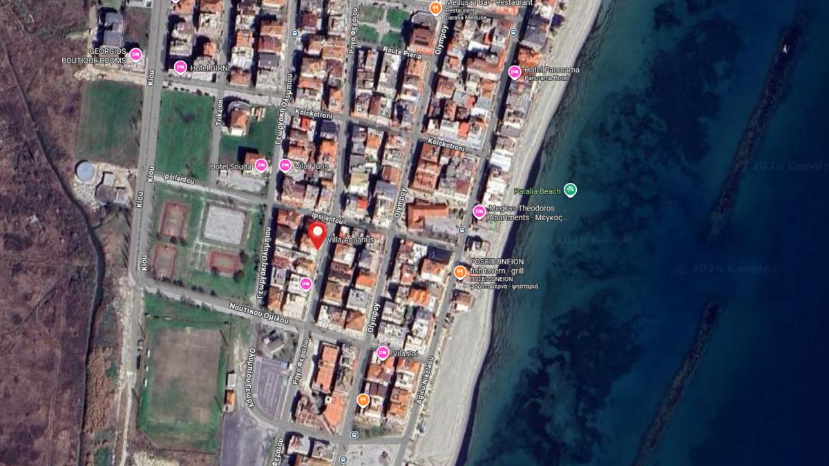 Vila Aquarius se nalazi na 200 metara udaljenosti od plaže u Paraliji, odnosno dva minuta hoda. Najbliži market je udaljen oko 50 metara. Vila raspolaže dvokrevetnim i trokrevetnim studijima koji se nalaze u prizemlju, visokom prizemlju i na prvom spratu. Svaki studio ima kompletno opremljenu čajnu kuhinju, TWC, TV, klima uređaj i balkon ili terasu. Korišćenje klima uređaja se dodatno naplaćuje na licu mesta 6 eura dnevno (nije obavezno). Gostima je na raspolaganju besplatan wireless internet. Posteljina se menja svakih 5 dana.