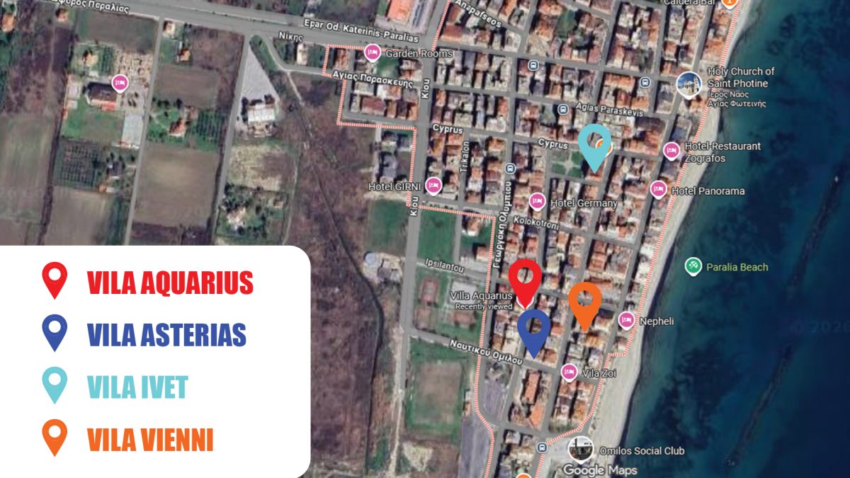 Vila Asterias se nalazi na oko 80 metara udaljenosti od najšireg dela plaže u Paraliji, odnosno minut hoda, a do centra mesta je potrebno oko 6 minuta hoda. U neposrednoj blizini vile se nalaze supermarket i pekara. Na 50 metara udaljenosti od vile se nalazi parking koji se ne naplaćuje. Vila raspolaže dvokrevetnim i trokrevetnim studijima koji se nalaze u prizemlju i na prvom spratu. Svi studiji poseduju kompletno opremljenu čajnu kuhinju, TWC, TV, klima uređaj i balkon ili terasu. Korišćenje klima uređaja se dodatno naplaćuje na licu mesta 6 eura dnevno (nije obavezno). Gostima je na raspolaganju besplatan wireless internet. Posteljina se menja svakih 5 dana.