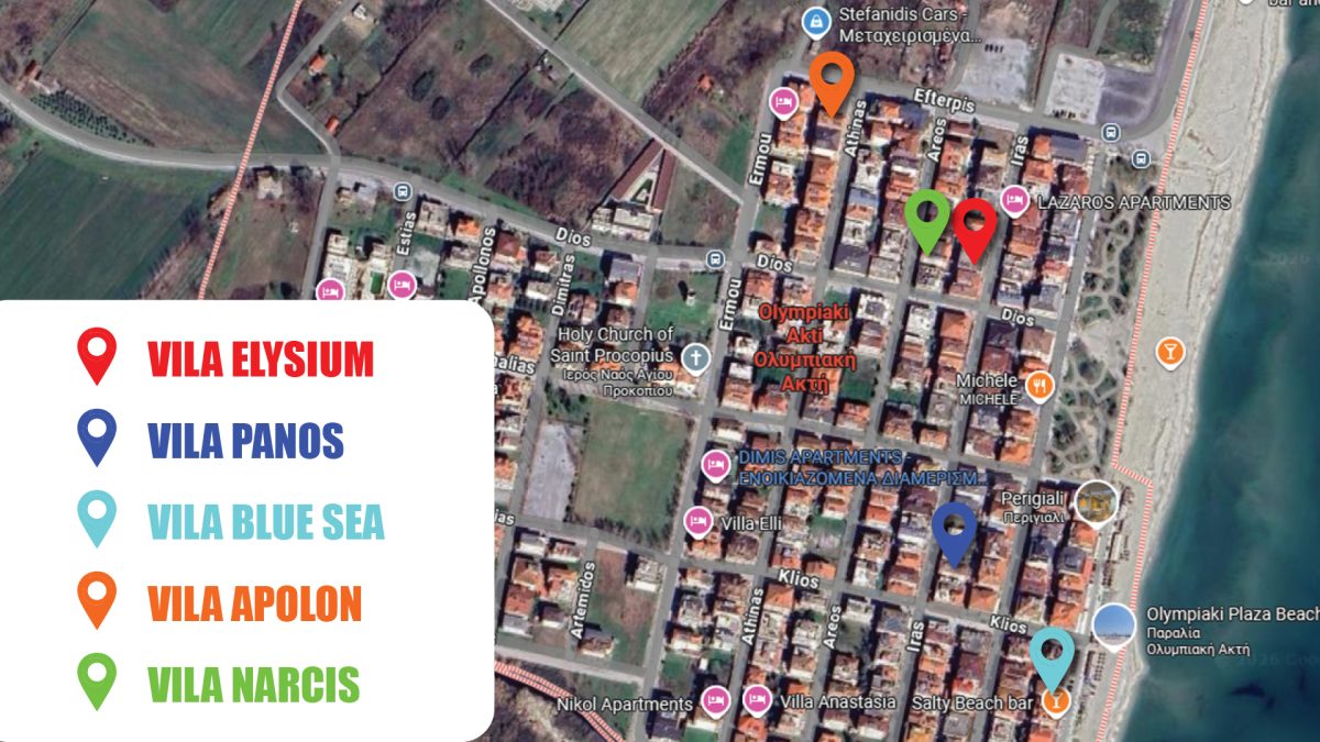 Vila Blue Sea ima odličnu lokaciju, nalazi se na šetalištu Olympic Beach-a, na samo nekoliko metara od plaže. Najbliži market je udaljen oko 10 metara. Vila poseduje dvokrevetne i trokrevetne studije kao i apartmane za 4 i 5 osoba, od kojih pojedini imaju pogled na more. Smeštajne jedinice se nalaze u prizemlju, na prvom, drugom i trećem spratu i poseduju kompletno opremljenu čajnu kuhinju, TWC, TV, klima uređaj i balkon ili terasu. Korišćenje klima uređaja nije uračunato u cenu aranžmana i plaća se na licu mesta 6 eura dnevno (nije obavezno). Gostima je na raspolaganju besplatan wireless internet. Posteljina se menja svakih 5 dana.