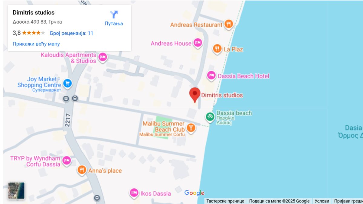 - VILA DIMITRIS ( 39.68197617675439, 19.840687715731793 ) nalazi se u Dasiji, na samoj obali u blizini hotela Ikos i bazena Malibu. Autobuska stanica i supermarket su udaljeni 250m a u neposrednoj blizini se nalazi šetalište uz more, kafei, restorani. Vila raspolaže sa 1/2+1 studijima. Svi studiji su opremljeni čajnom kuhinjom (rešo sa dve grejne ploče), frižiderom, kupatilom sa tuš kadom, TV-om, wi-fi internetom, klimom (klima se doplaćuje 10 € po danu).Struktura:
