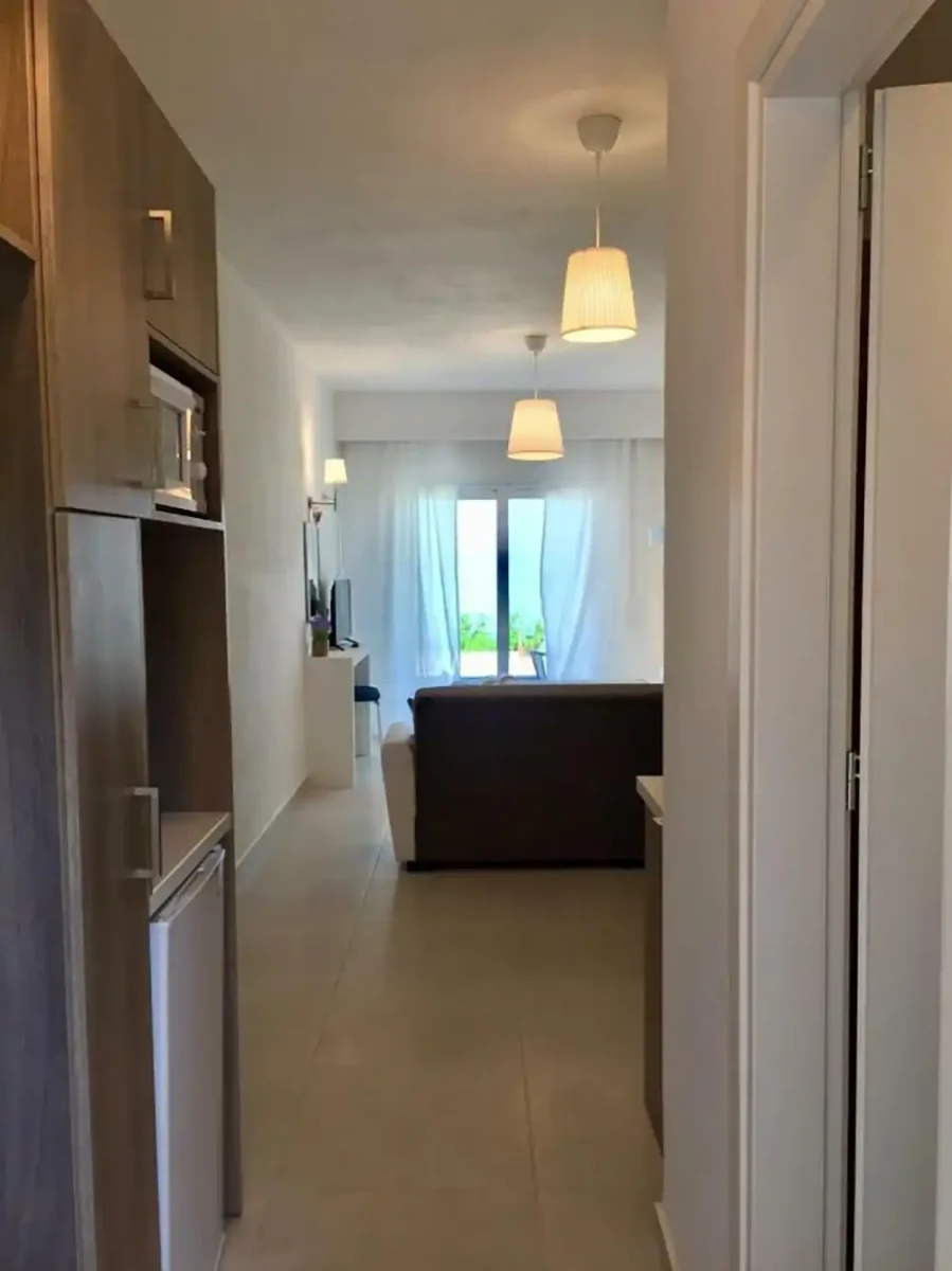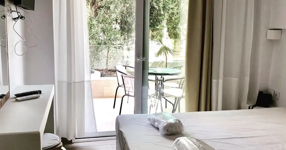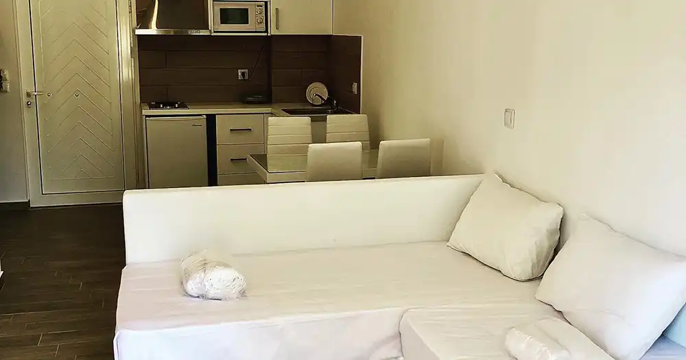 Smeštaj: Vila raspolaže dvokrevetnim studijima (max 2 odrasle osobe i 1 dete do 3 god. ) i trokrevetnim studijima ( max 3 odrasle osobe i 1 dete do 3 god. ), koji se nalaze se na prvom i drugom spratu. Apartman četvorokrevetni se nalazi na prizemlju, terasa je sa pogledom na baštu i pogled bočno more, u spavaćoj sobi je francuski krevet, a u dnevnom boravku, gde se nalazi i kuhinja su dva singl kreveta i ima dva klima uređaja (max 4 odrasle osobe I 1 dete do 3 godine). Studiji i apartmani poseduju opremljenu kuhinju za pripremu laganih obroka, nije dozvoljena priprema ribe, TWC, terasu, TV, internet i klima uređaj (doplata na licu mesta 6 eura dnevno za studio, a 10 eura dnevno za apartman). Vila poseduje bar na plaži i postoji mogućost iznajmljivanja jednog suncobrana i dve ležaljke uz minimum naručena dva pića. Sadržaj: zamena posteljine i peškira je jednom u toku smene. Vila poseduje bar na plaži i postoji mogućost iznajmljivanja jednog suncobrana i dve ležaljke uz minimum naručena dva pića. Vila ne poseduje parking.